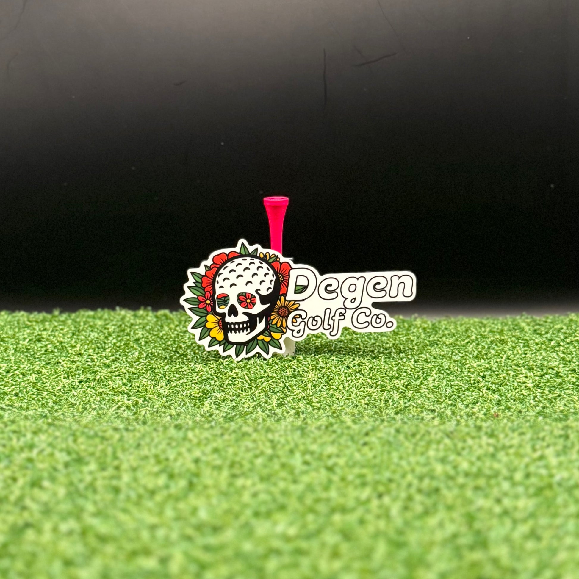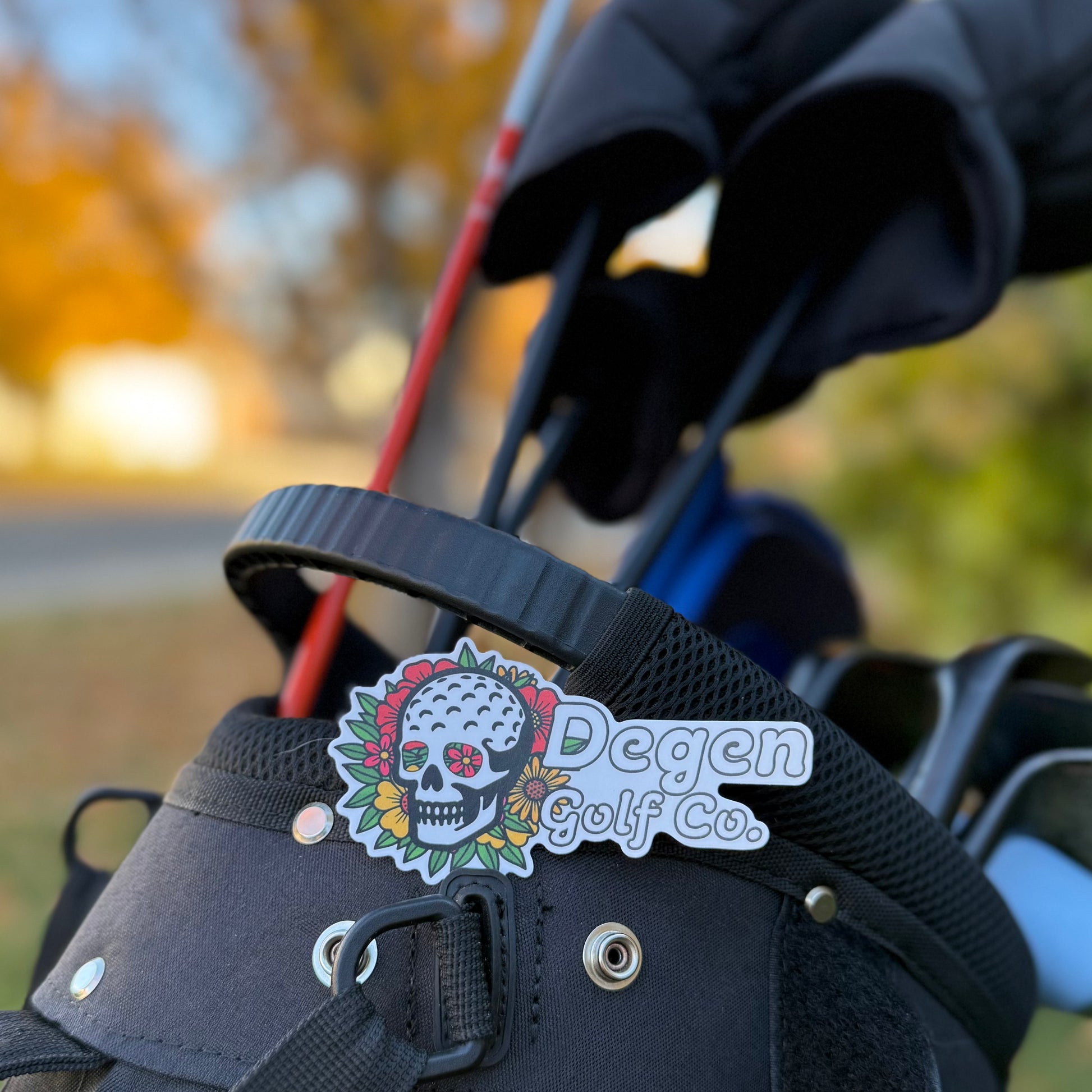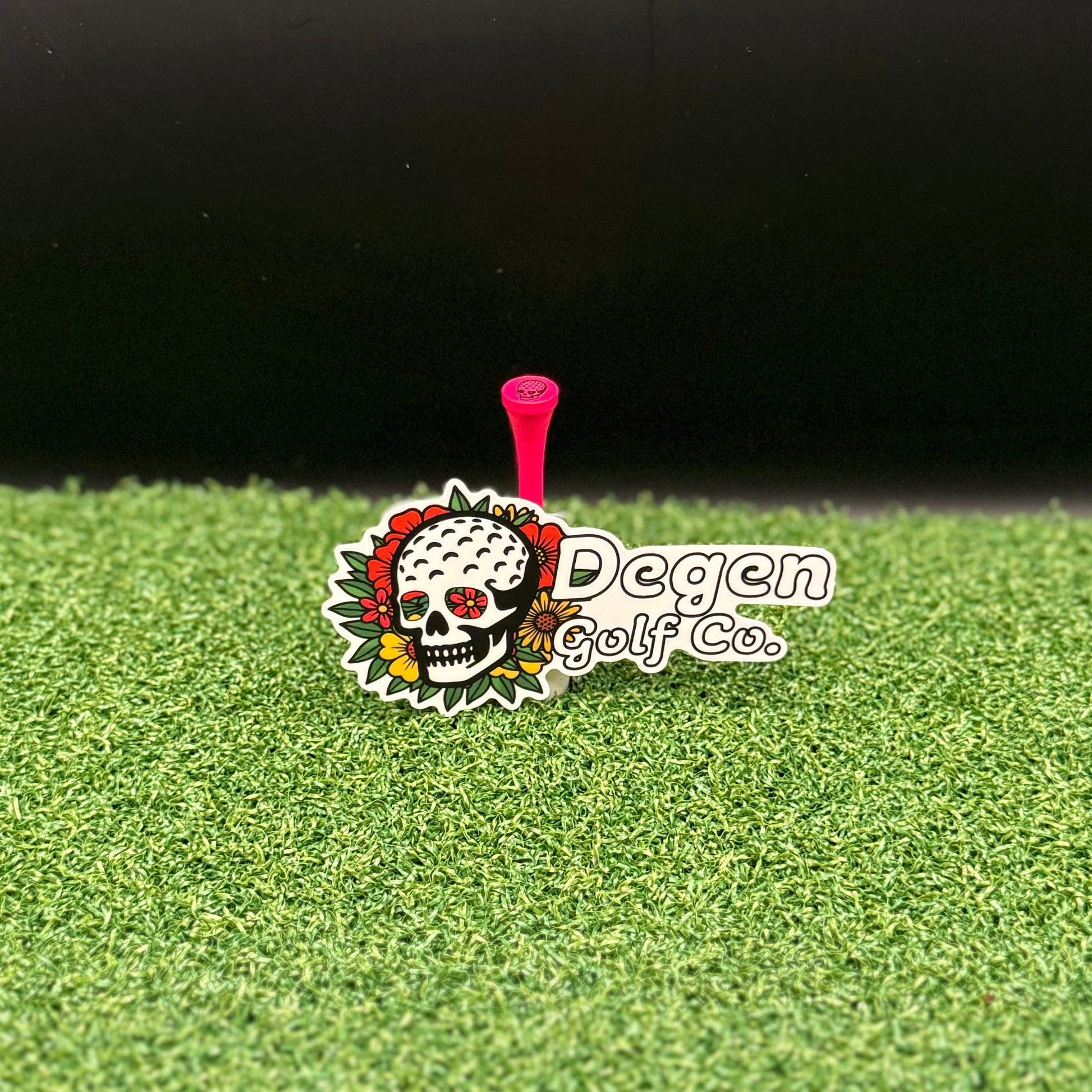 A clean hit of chaos. This floral Degen skull blends bold color with that unmistakable rebel edge. Perfect for players who swing hard, laugh harder, and live outside the county-club comfort zone. Durable, weatherproof, and built for grinders.