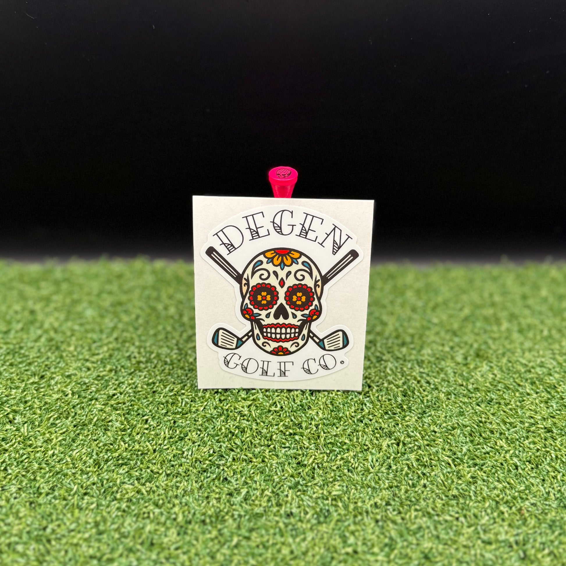 A colorful spin on the Degen Skull - clean lines, crossed clubs, and a nod to golf's wild side.